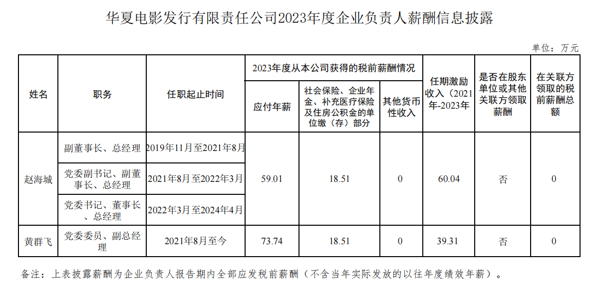 华夏电影发行有限责任公司2023年度企业负责人薪酬信息披露