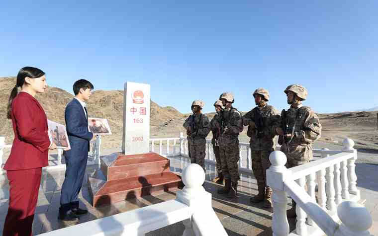 湖南雷锋纪念馆雷锋精神宣讲团在163号界碑,为部队官兵讲述雷锋故事。