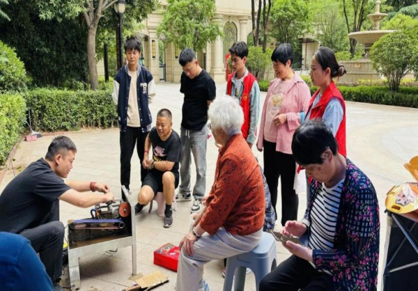 志愿者为居民打磨道具。图片来源:长安区委宣传部
