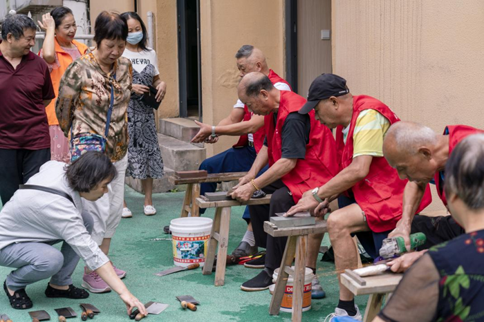 8月31日,浙江省台州市临海市鹿城社区温暖之家的志愿者们正在为居民免费磨刀。新华网 钟奕 摄