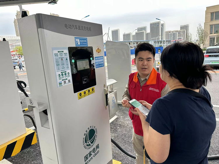 9月24日,国家电网天津滨海供电分公司于家堡双碳创新充电站的工作人员指导车主使用手机支付充电费用。新华网 于珊 摄
