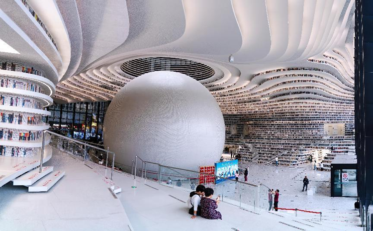 来到滨海新区图书馆,这座科技感十足的建筑形似一个巨大的眼睛,被称为“滨海之眼”。图书馆内部,书架犹如层层白色的山峰向上延伸,阶梯如朵朵海浪向远处铺开,完美诠释了“书山有路,学海无涯”。