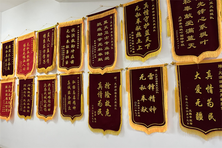 天津滨海蓝天救援队东疆工作站内的部分锦旗(9月24日摄)。新华网 于珊 摄