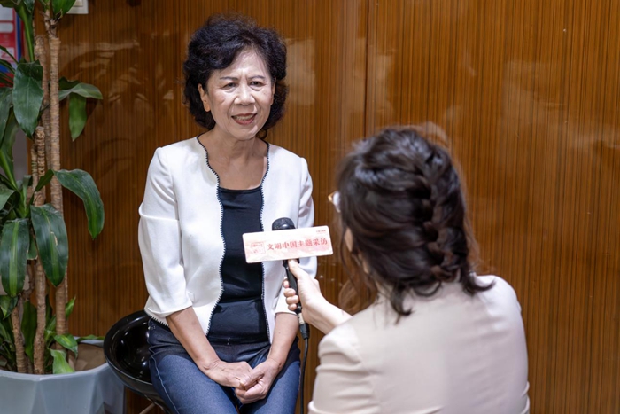 2023年12月14日,中国好人、广东省道德模范、深圳市凤凰涅槃艺术团团长郭丽英接受采访。新华网 钟奕 摄