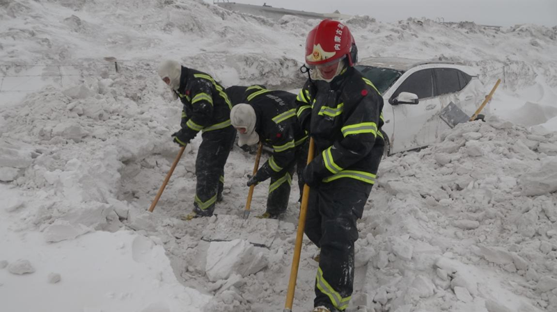 当时的白毛风能见度不足五米,个别路段积雪堆积严重阻隔了过往车辆,消防车也无法进入现场进行牵引。为尽快使车辆和人员脱困,他们决定徒步前往救援。根据现场情况迅速消防员分成两组,一组负责协助用铁锹清理车辆轮胎处及周围的积雪;另外一组逐车询问车辆燃油储量和人员被困情况,并及时对被困人员情绪进行安抚。