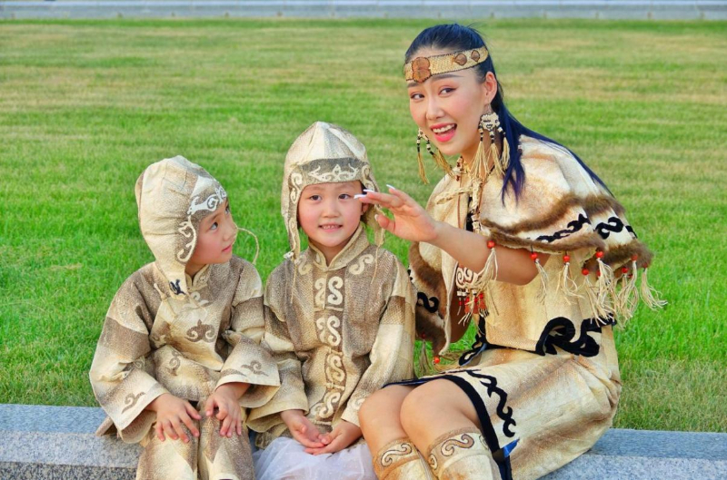 身穿鱼皮衣的赫哲族青年和儿童演唱伊玛堪。同江市委宣传部供图