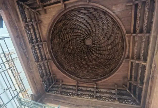 古戏台戏台虽然不大,但其工艺要求之高令人惊叹,特别是戏台内部的藻井。这个由19层共456个小斗拱穿插承托的螺旋上凸式屋顶,形如民间养鸡的竹编笼子,俗称“鸡笼顶”。