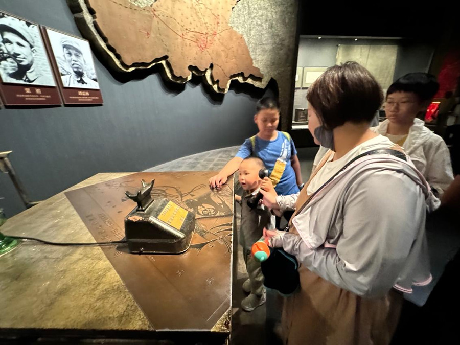 游客引导孩子在纪念馆内聆听。张焕钰 摄