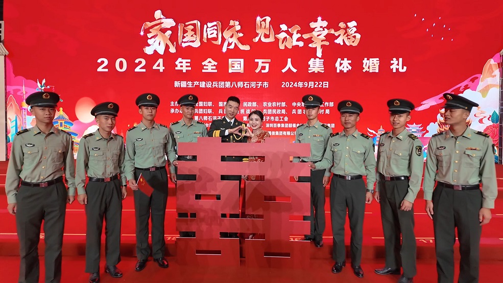 喜庆的灯笼高高挂起,祝福的对联传递着美好的祝愿。金秋9月,“家国同庆 见证幸福”2024年全国万人集体婚礼在全国50个会场同步举行,八师石河子市作为分会场之一,共有来自兵团各行各业、各民族的75对新人以及10对金婚伉俪,手牵手走过红毯,共同许下爱的誓言。